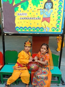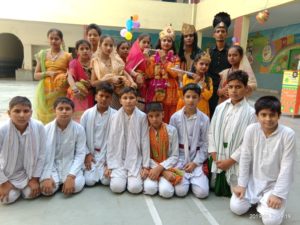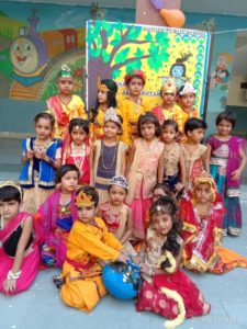 The students Naveen, Sahil, Neha, Kajal from school music council sang very beautiful songs and impressed everyone by their melodious voices . the younger students upto 8th class gave very beautiful glimpses of radhe Krishna, Sudama and other characters on this occasion. Urvashi played the role of Krishna and rooted out the ego of Kaaliya naag. Daksh rajput played role of krishan in another performance and struck and earthen pot having makkhan in matki fodo celebration. Nursery toddlers sang avery beautiful song ‘ chhote chhote gwal ‘ and dance as well in the end the school principal appreciated everyone to make the programme successful and wished this day to one and all.
